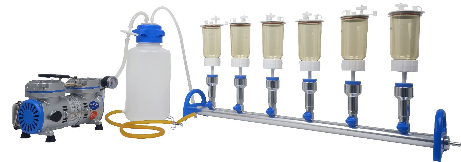 ●集液装置——收集过滤后的废液,安装在过滤支架和抽滤泵之间。采用PP聚丙烯材质,具有一定透明度便于观察液位。聚丙烯材质可以耐受高温高压灭菌,还可以耐受含氯消毒液的浸泡。此外改款集液瓶底部带有快手排液口,可以松开排液夹快速导出费用,不需要停下工作,拆装过滤系统来排液,更方便。