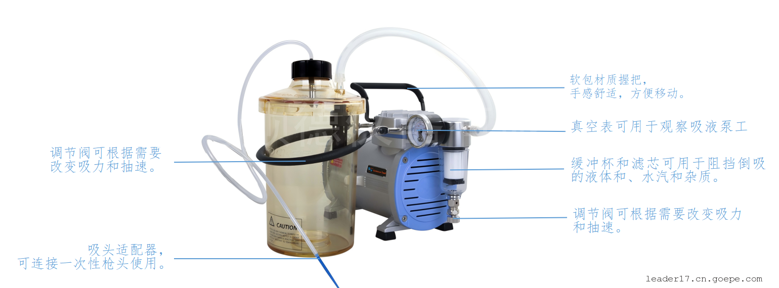 8. 可调节的吸力和吸液速度——配有调节阀,可以根据实际工作情况,任意调节的吸力和抽速,能够避免吸力过大抽走需要保留的物质,也能根据实际需要控制吸液时间。